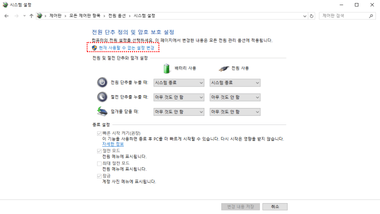 상단의 “현재 사용할 수 없는 설정 변경”을 클릭해줍니다.