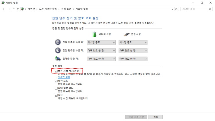 그러면 아래쪽에 “빠른 시작 켜기(권장)”가 활성화 되는데요 클릭해서 체크를 해제합니다.