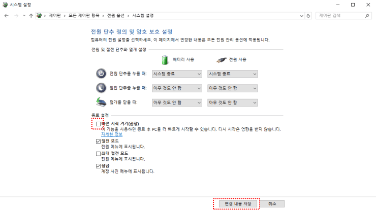 “변경 내용 저장” 버튼을 클릭한 후, 노트북을 재부팅합니다.