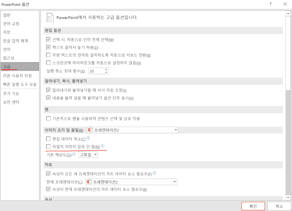 - ‘이미지 크기 및 품질’ 항목에서 ‘파일의 이미지 압축 안 함’ 체크